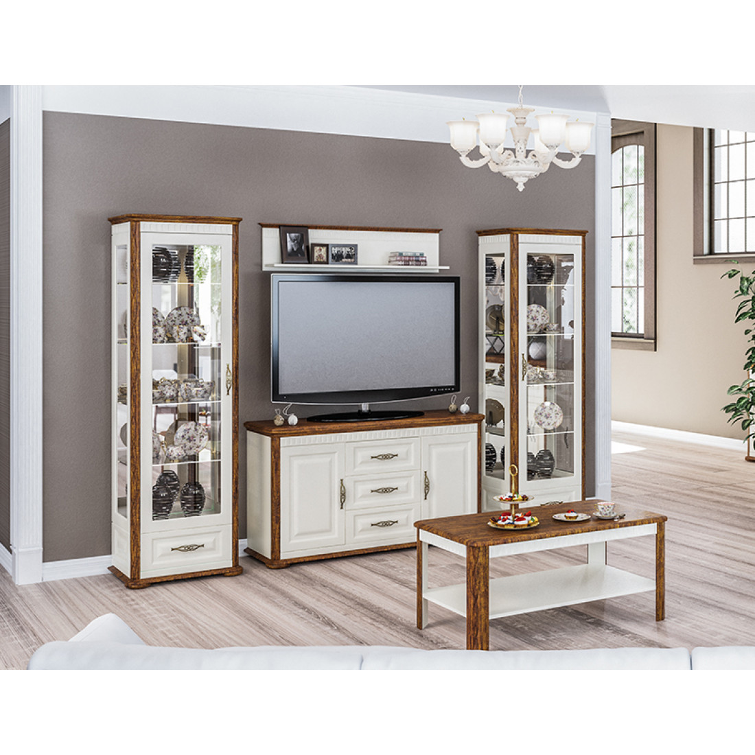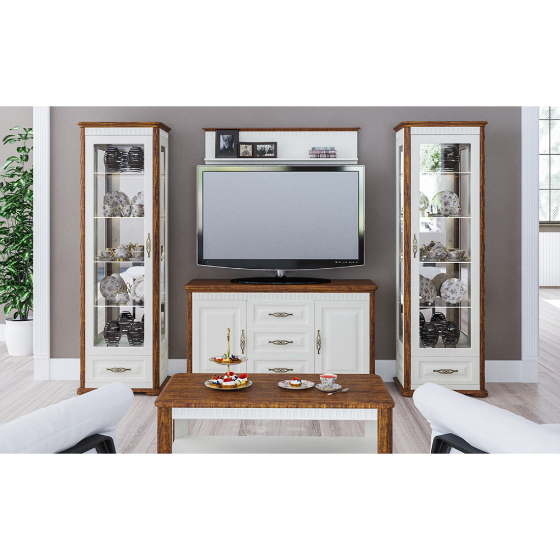 Витрины гостиной Марсель послужат прекрасной основой, а тумба для телевизора и журнальный столик, прекрасным дополнением комплекта.