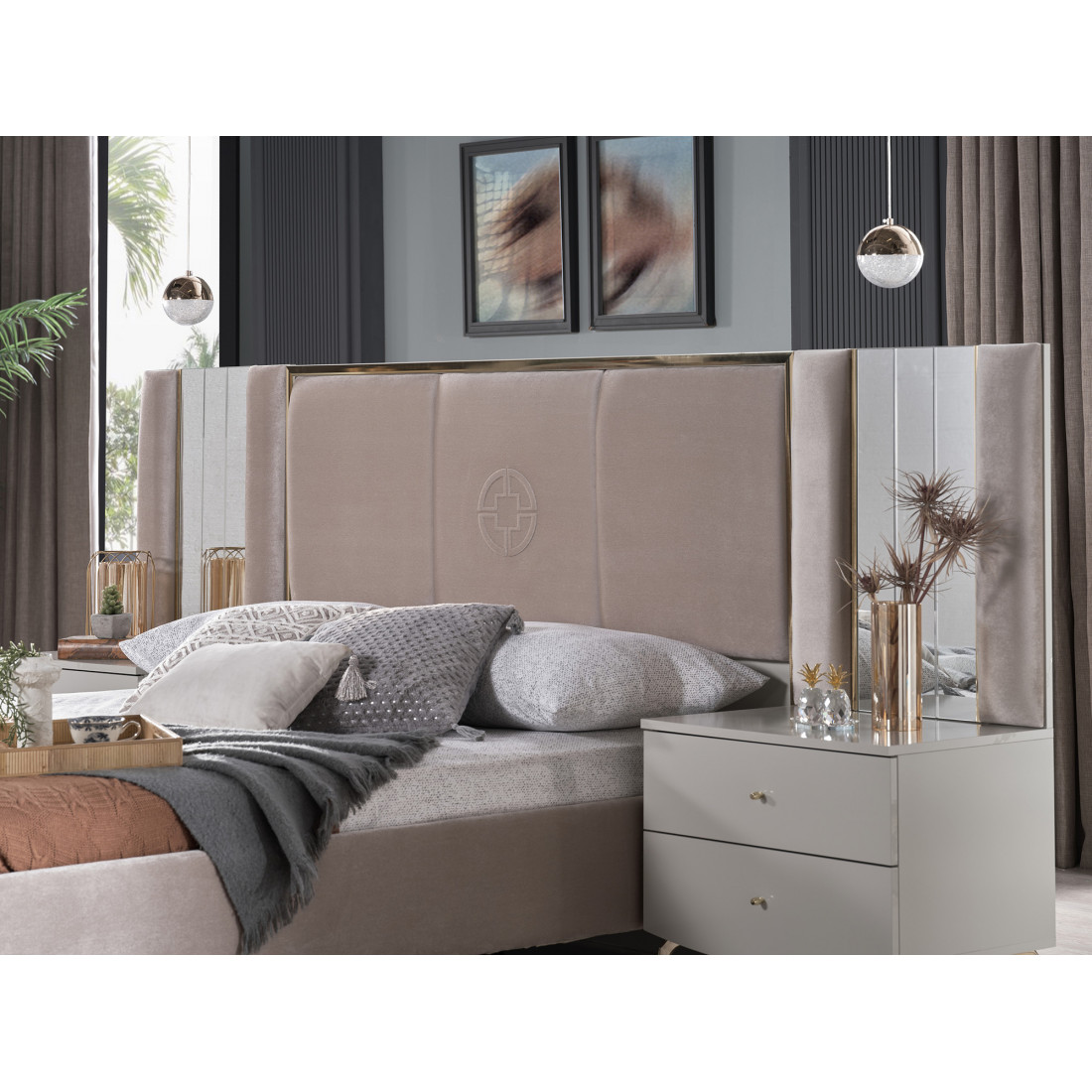 Спинка кровати щитовой конструкции из облицовочной плиты ДСП, с боковым и верхним накладным декоративным профилем (плита МДФ), профиль декорирован фитилем в цвете золота.