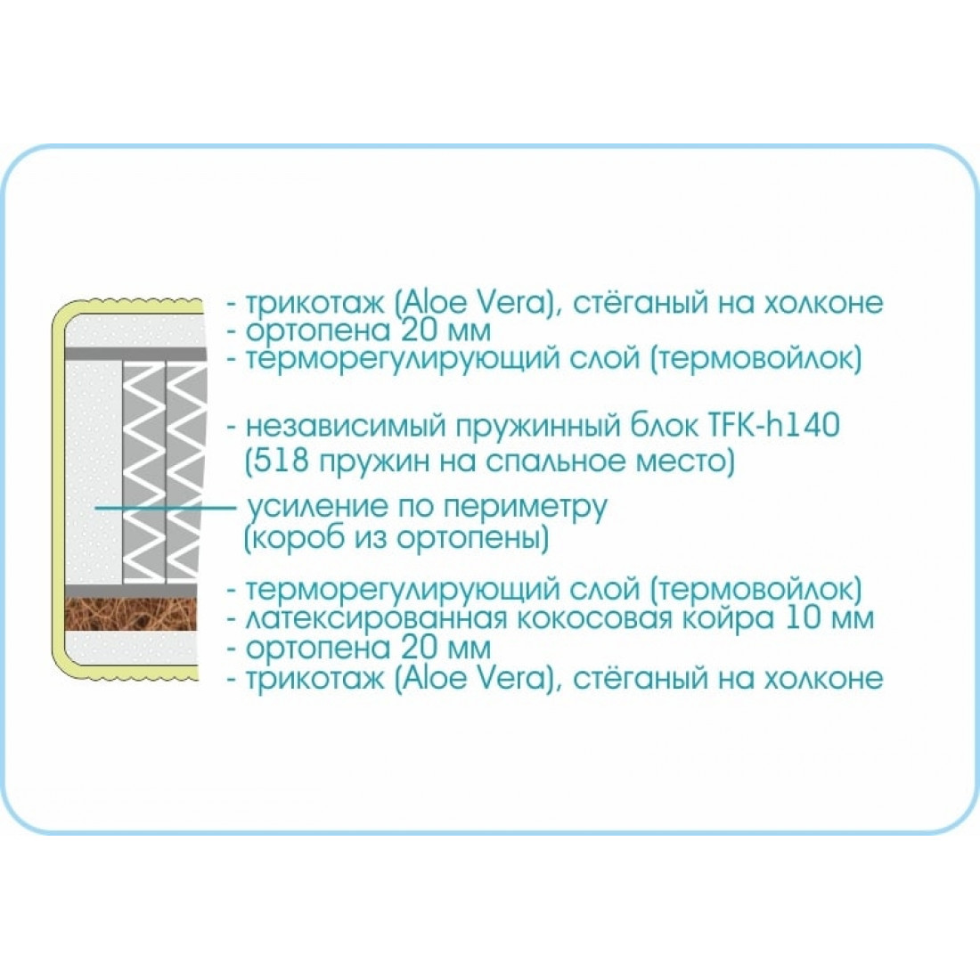 Наполнение: независимый блок TFK, высота блока 140 мм, ортопена 20 мм с двух сторон, кокосовая плита 10мм с 1 стороны, терморегулирующий слой с 2-х сторон, усиление по периметру - короб из ортопены.